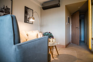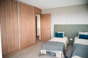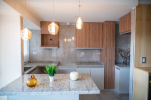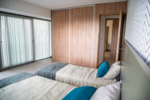 Es por eso que, seleccionamos solo dos muestras que combinan muy bien entre sí y utilizamos una de estas para realizar los zócalos de todo el departamento. Entonces así no hay disonancia entre los ambientes y cada espacio está conectado con el otro.